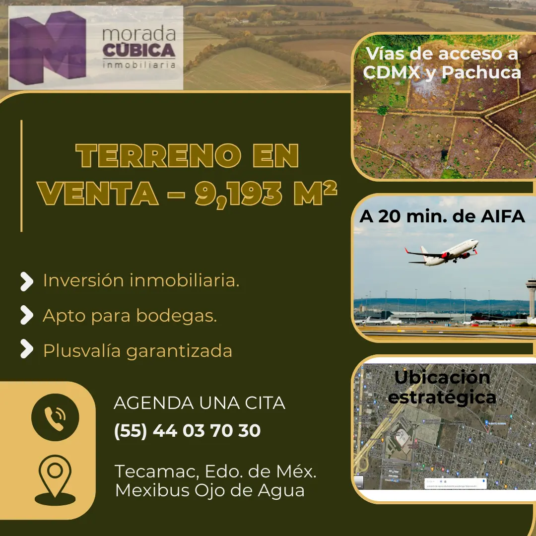 Terreno de 9,193 m² en Tecámac, Edo. Méx. 🏗️ PRECIO POR METRO CUADRADO Ideal para bodegas o proyectos inmobiliarios. 📍 Ubicación estratégica: ✅ A 20 min del AIFA ✈️ ✅ A 30 min de la CDMX 🌆 ✅ Conexión con la México–Pachuca 🚗 ✅ Cerca del Mexibús Ojo de Agua 🚉 🔌 Servicios a pie de terreno: agua, luz y drenaje listos. 💡 ¡Haz crecer tu inversión en una zona con plusvalía garantizada! 📲 Mándanos mensaje y agenda tu visita hoy mismo.